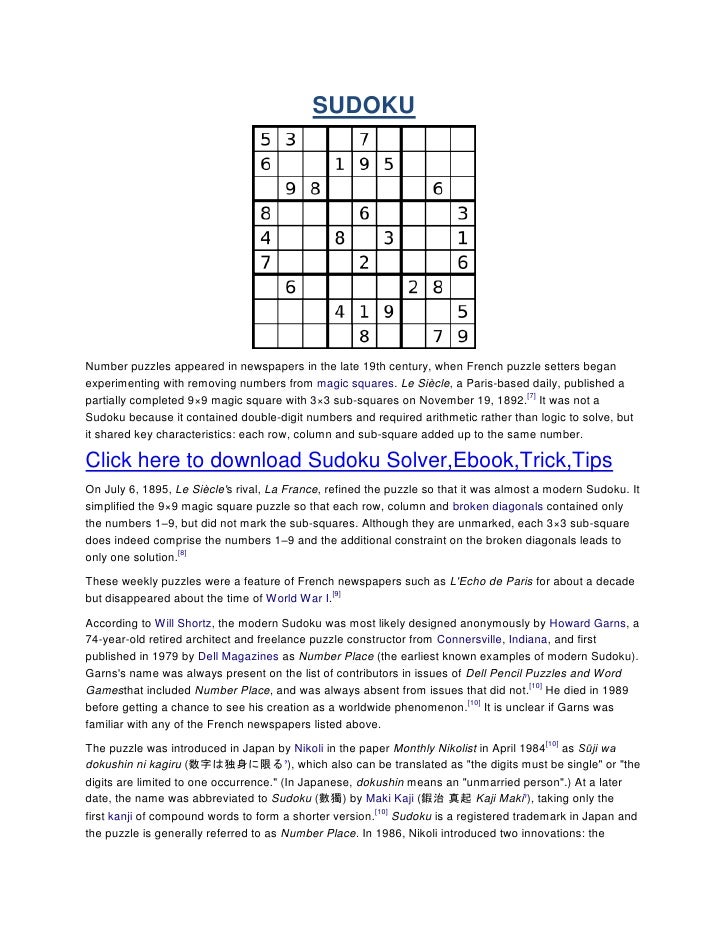 Sudoku Sudoku, or Sudoku, is a Japanese fun puzzle game Sudoku uses numbers, but no mathematics is needed, and that is why, it is so popular If you are looking for Sudoku free games, search no more Over wwwsudokuname you can find thousands of online Sudoku puzzle games that you can play for free All you need to do is to learn the rulesSimple Instructions Very Addictive & Fun Puzzle Game These are seven steps to have all solved Sudoku puzzles If you follow these steps strictly, you can complete every Sudoku puzzle with ease So, pocket and practice this guide on how to solve a Sudoku puzzle many times Once you get used to this process, you can solve it fast To update the latest puzzle game news as well as more tips to play